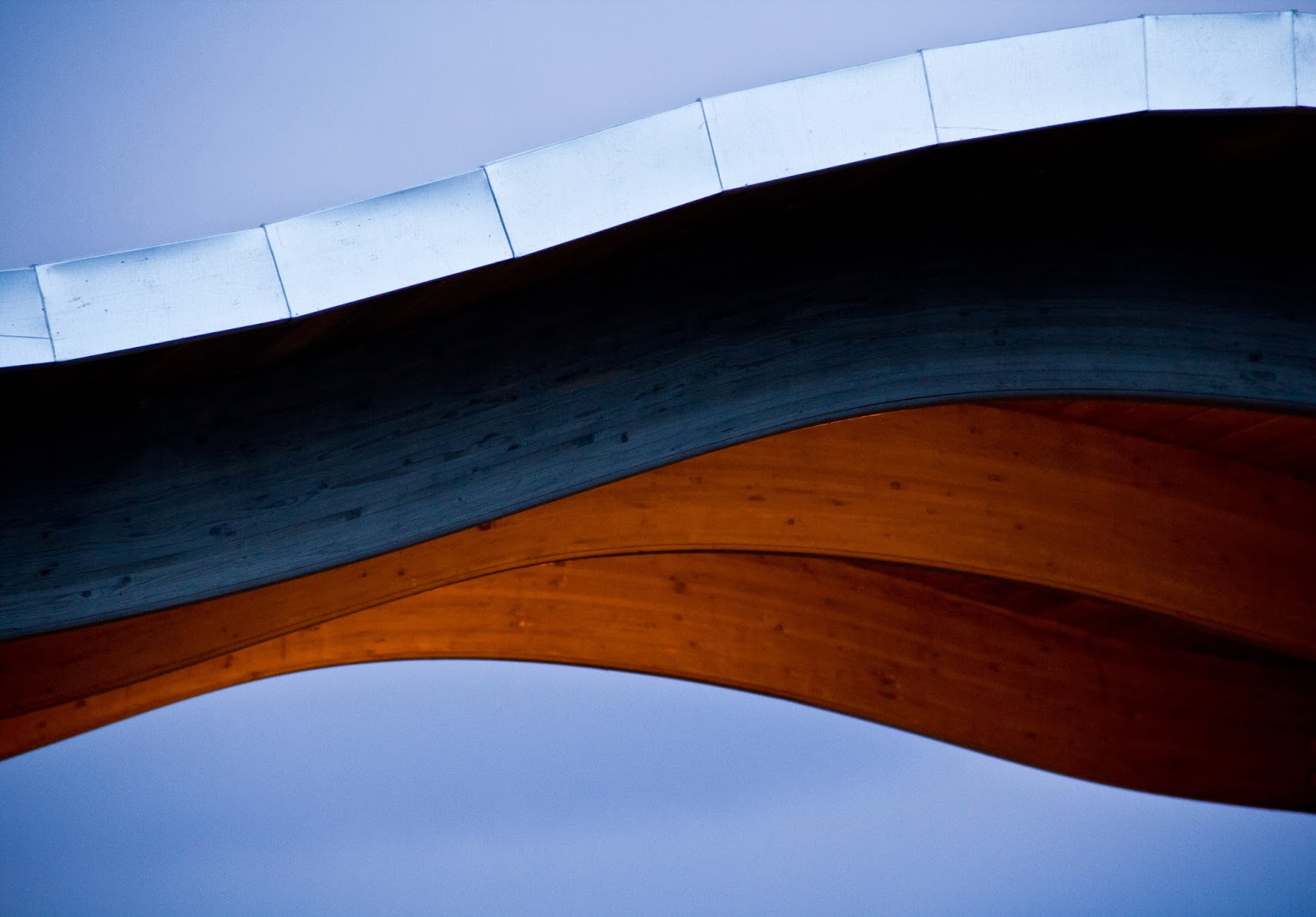 | This rooftop of the Iona Beach public washroom. The lighting underneath the wood frame showed off the red tones of the wood against metal. This was cool. |